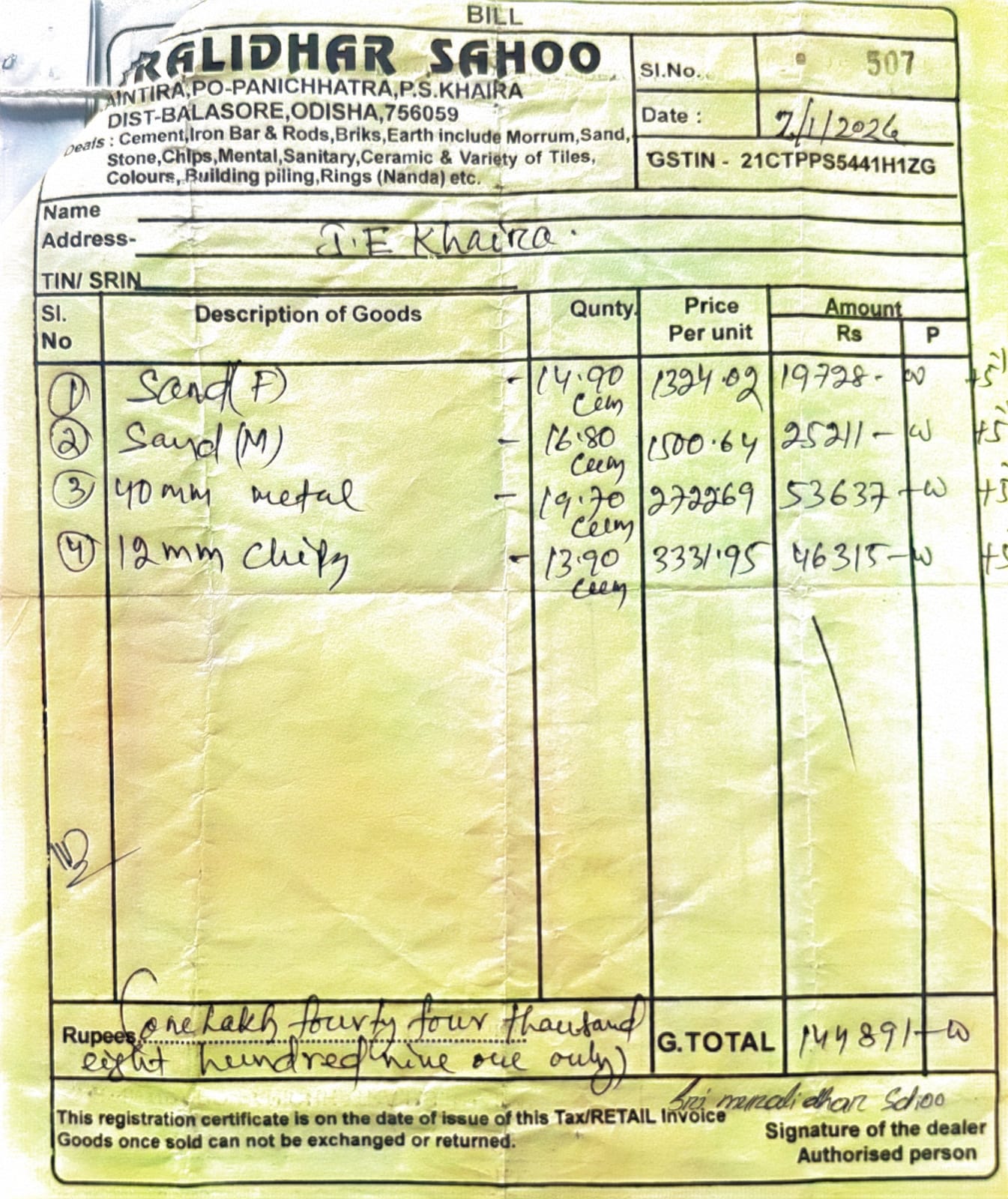 | Execution In Progress | Santosh Kumar Prusty (AE / JE) | 17-01-2026 | 21-01-2026 | Approved |