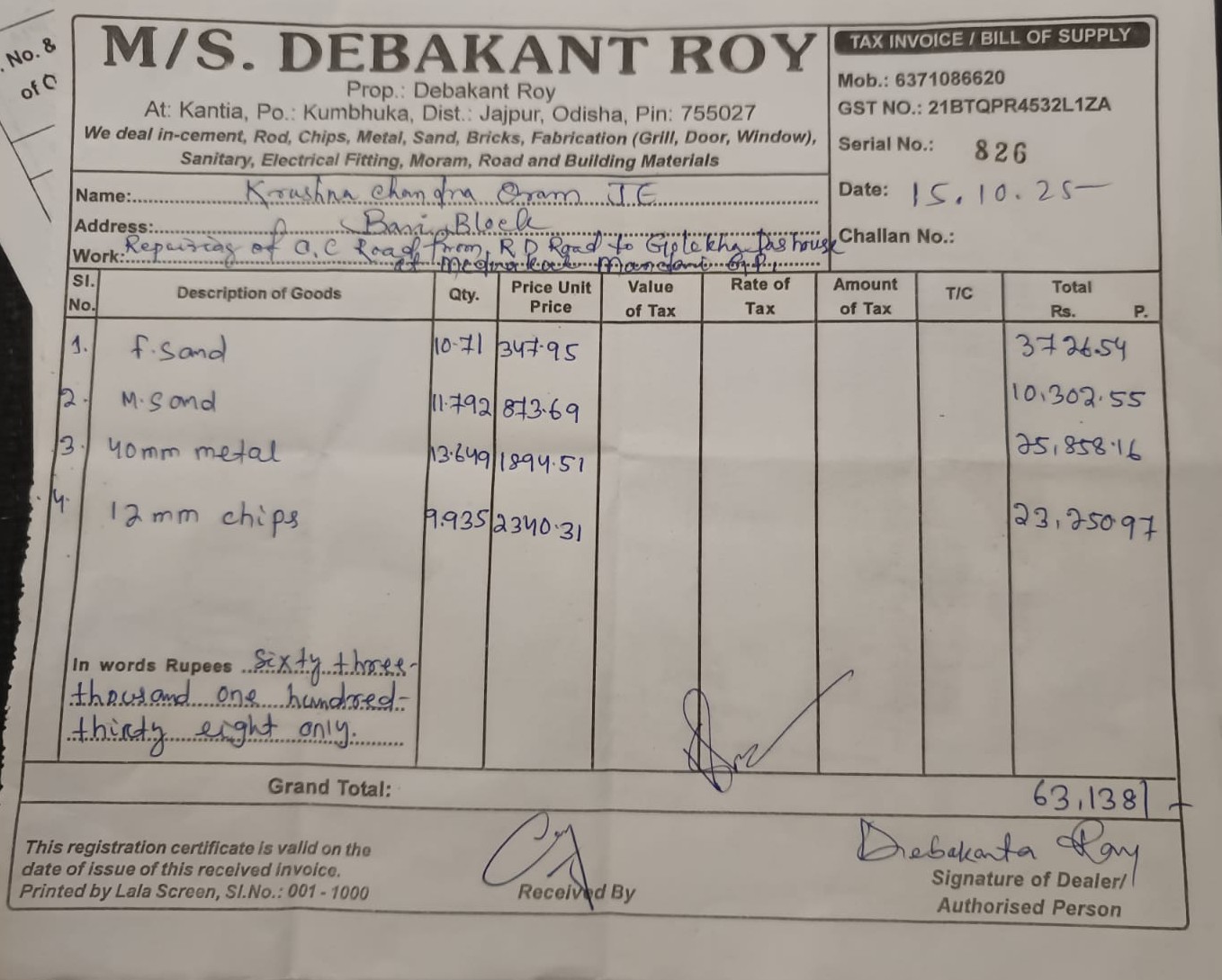 | Work Order Issued | Asit Kumar Mohanty (BDO) | 07-11-2025 | 07-11-2025 | Generated |