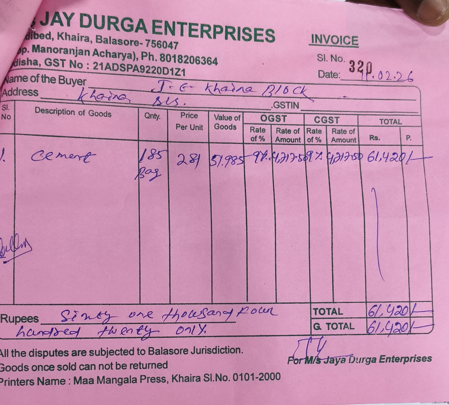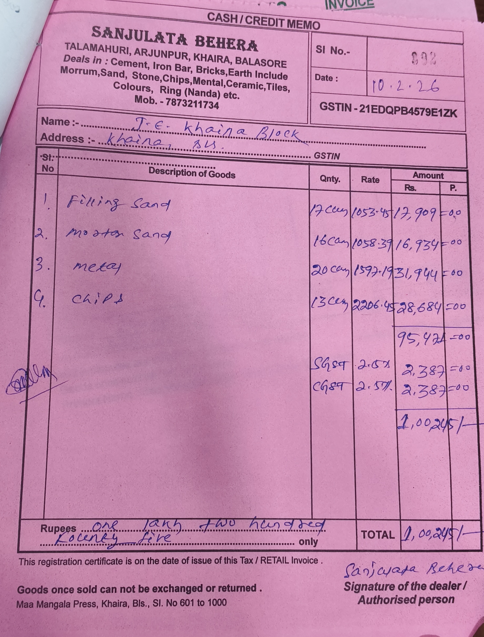 | Execution In Progress | KARTIK BEHERA (AE / JE) | 29-01-2026 | 26-02-2026 | Approved |