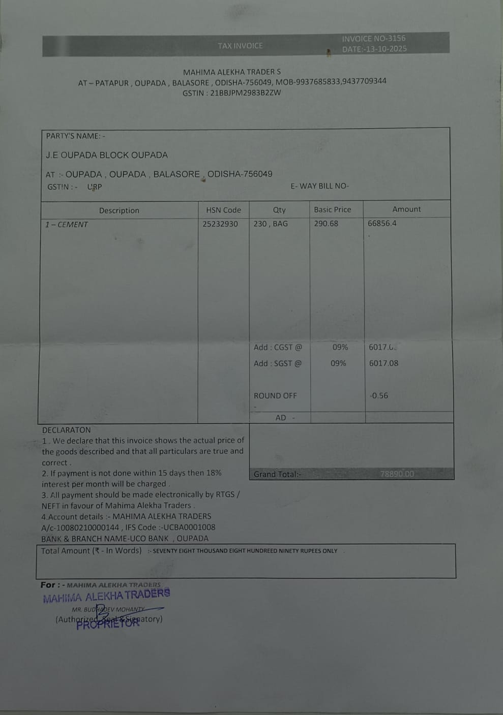 | Administrative Approval | Miss Saswati Sadual (BDO) | 07-11-2025 | 08-11-2025 | Approved |